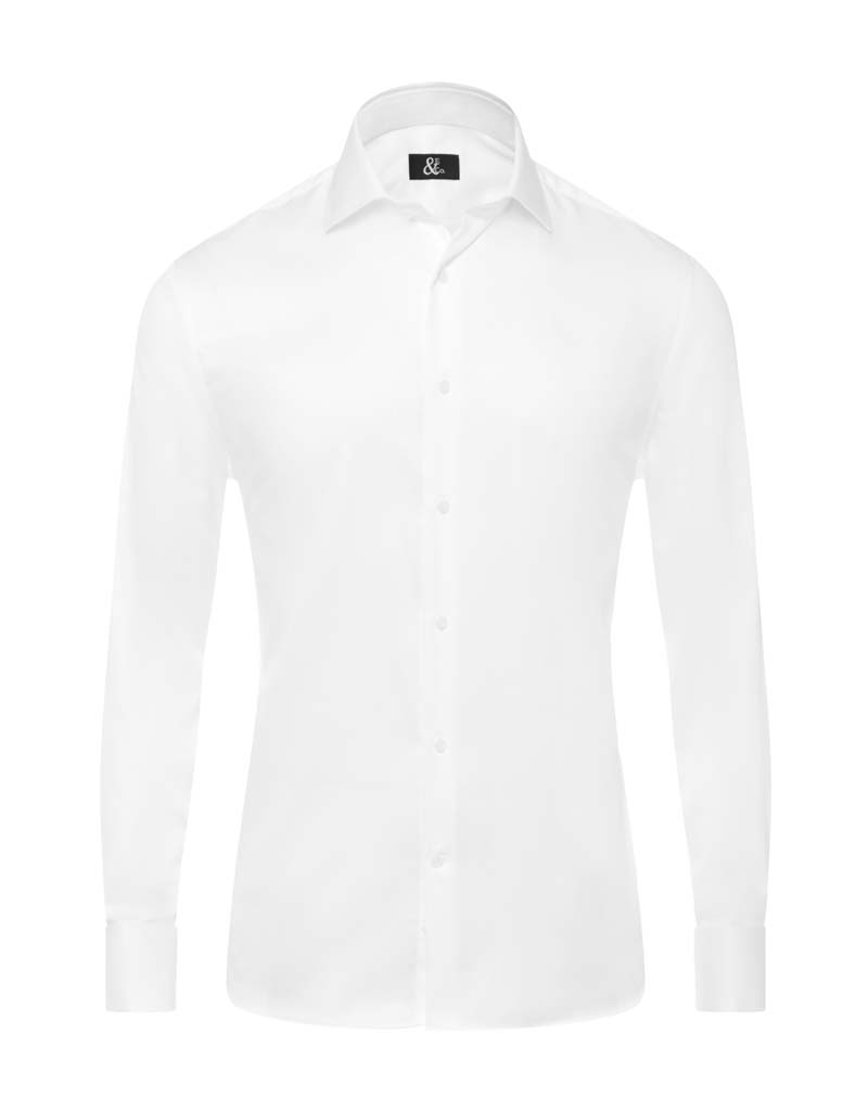 High medium-spread Cutaway collar. Buttoned placket. Last buttonhole is stitched horizontally for a superior hold.