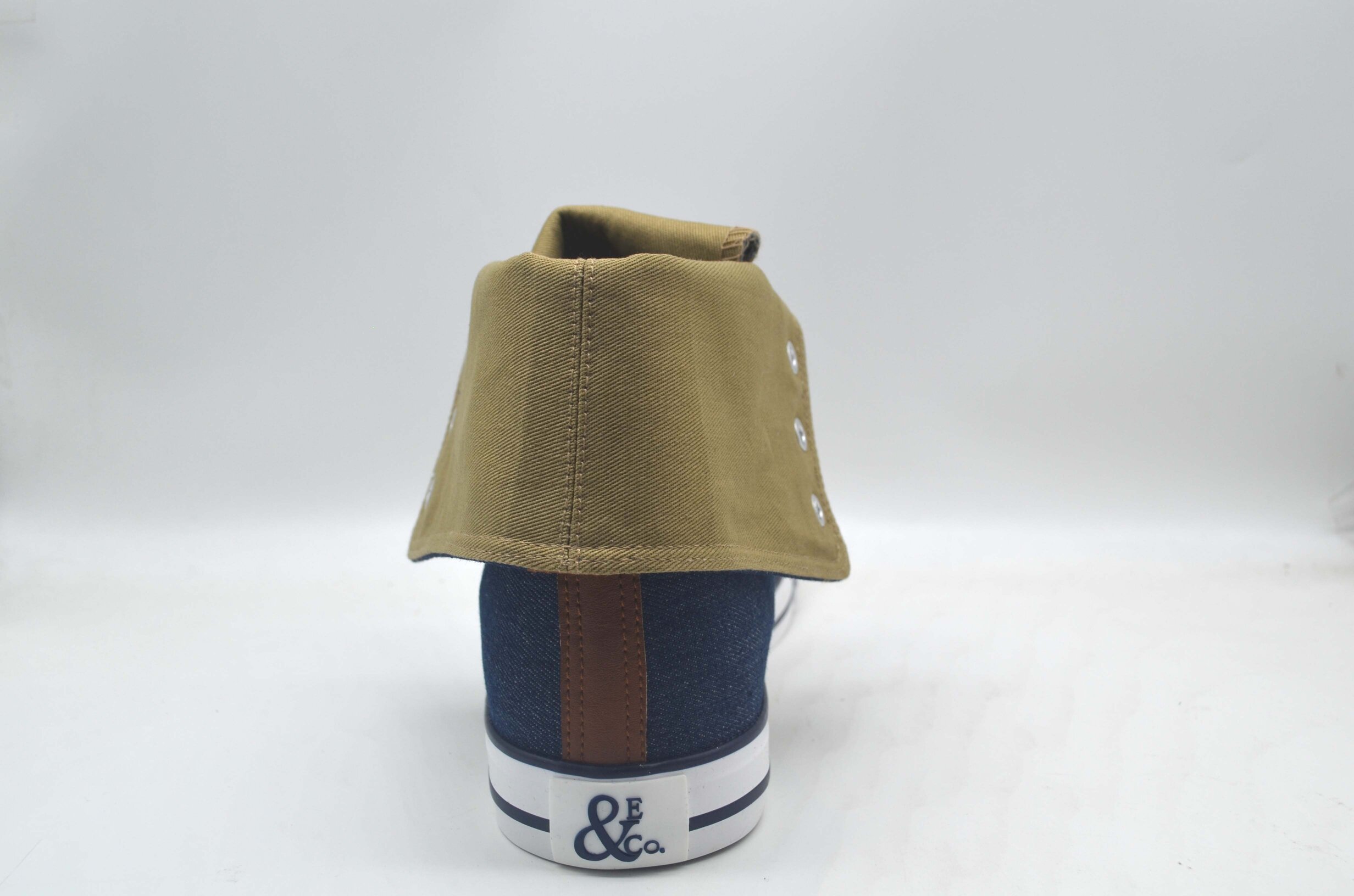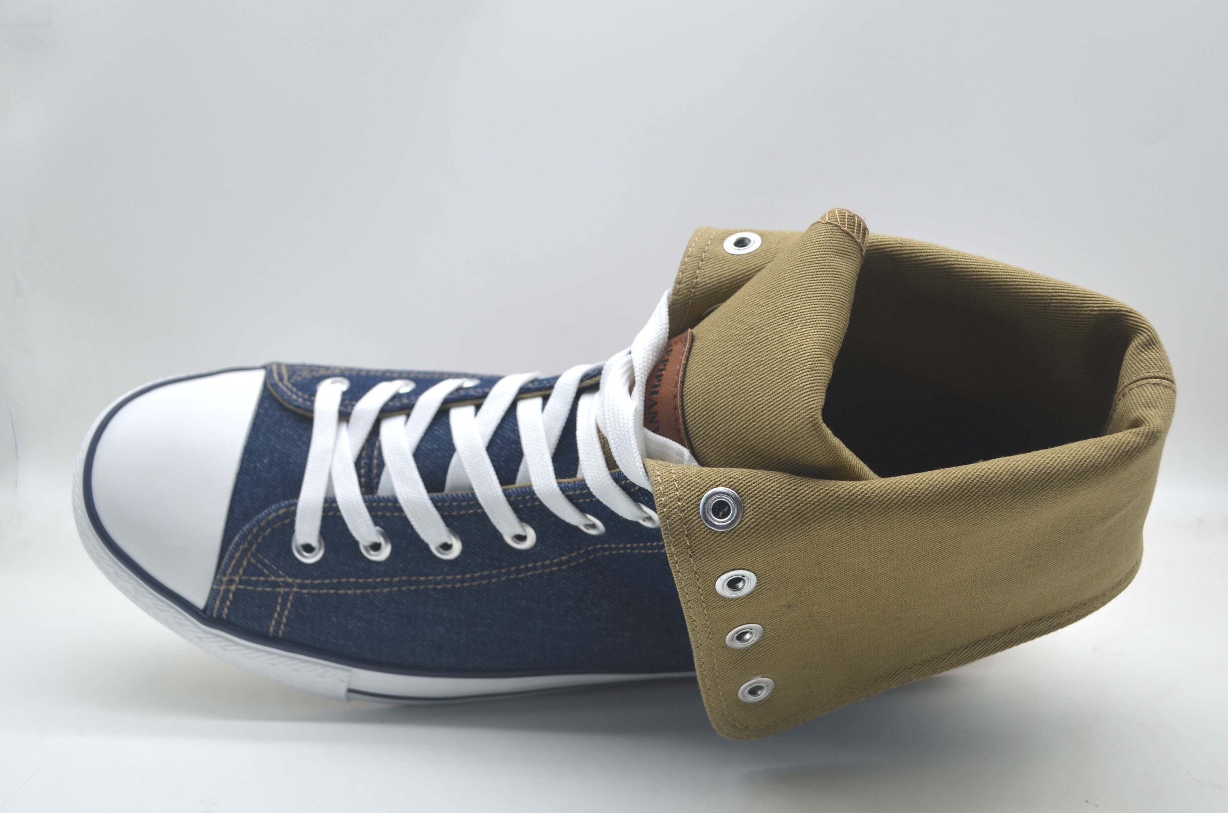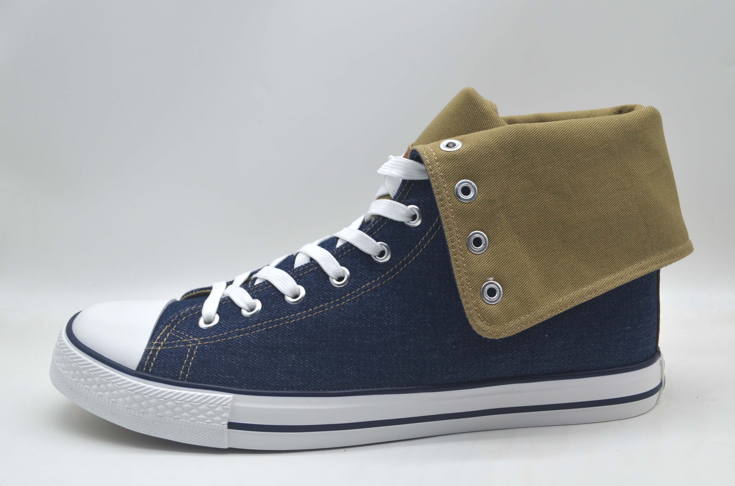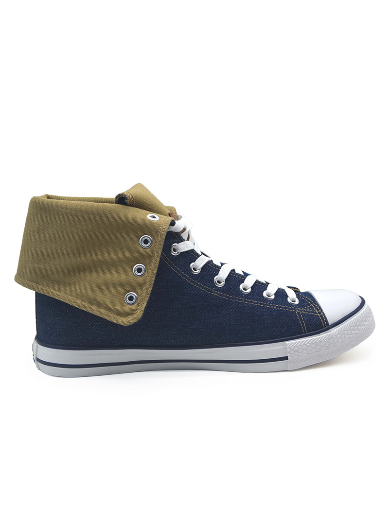 Classic men’s inverse denim sneaker. Lightweight and durable Denim upper. Design for Comfort and Flexibility. Standard Leather tongue label. Detailed inverse fold down khaki design with leather label. Color match stitching